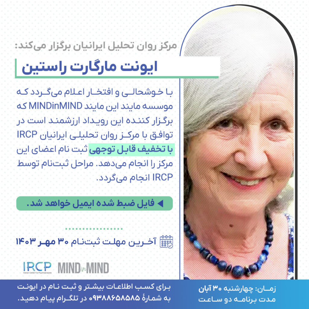 با خوشحالی و افتخار اعلام میگردد که موسسه مایند این مایند MINDinMIND که برگزار کننده این رویداد ارزشمند است در توافق با مرکز روان تحلیلی ایرانیان IRCP با تخفیف قابل توجهی ثبت نام اعضای این مرکز را انجام میدهد. مراحل ثبت نام توسط IRCP انجام میگردد.